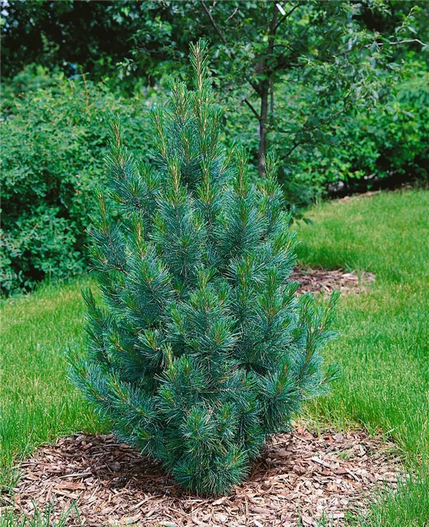 Zirbel-Kiefer 'Compacta Glauca' ist ein pyramidal wachsender, malerischer Baum mit lockerer Krone. Ihre silberblauen Blätter sind nadelförmig . An einem sonnigen Standort mit durchlässigem Boden erreicht sie gewöhnlich eine Höhe von ca. 2 m und wird ca. 1,2 m breit.