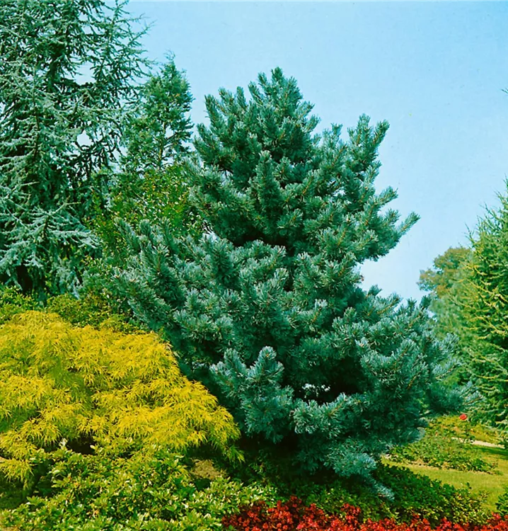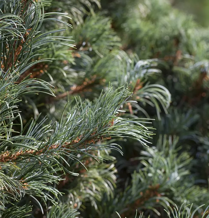 Die Mädchenkiefer ist immergrün. Ihre Nadeln sind blau-grün.