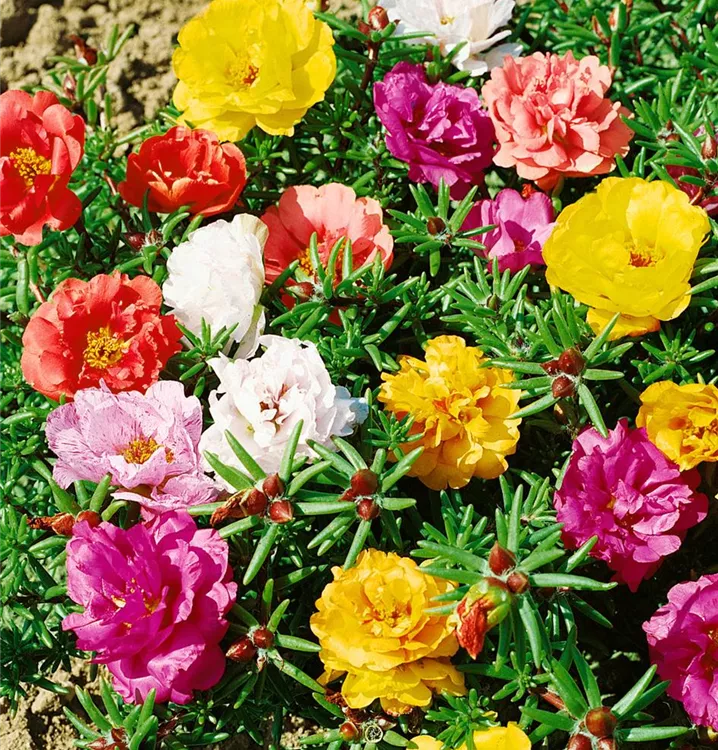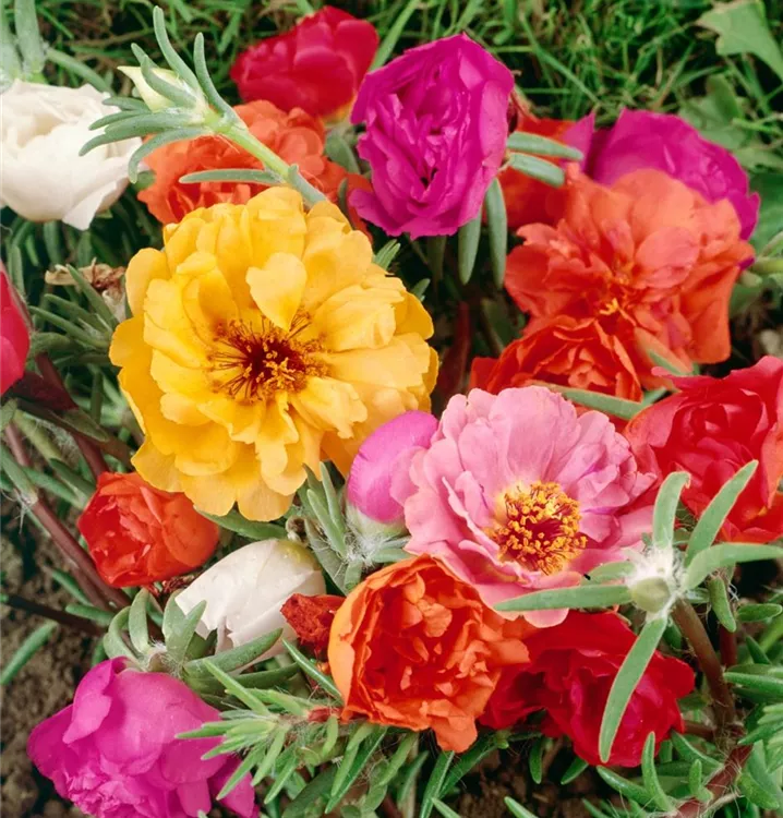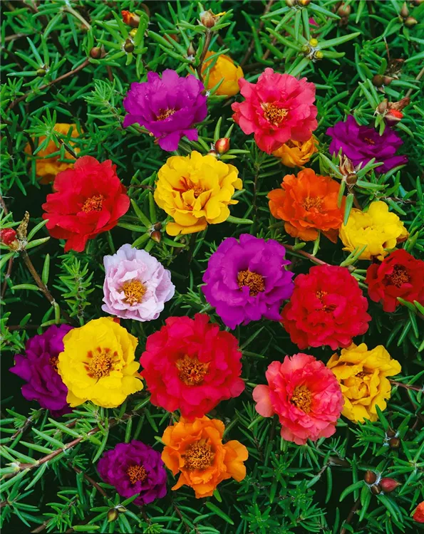 Das Gefüllte Portulakröschen (Portulaca grandiflora) ist eine beliebte Pflanze für den Balkon. Die unzähligen Blüten erscheinen, je nach Sorte, in verschiedenen Farben die ganze Saison hindurch. Ein sonniger Standort und ein durchlässiges Substrat werden bevorzugt.