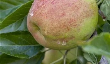 Die roten Kernfrüchte haben einen süß-säuerlichen Geschmack. Reifezeit ab September.