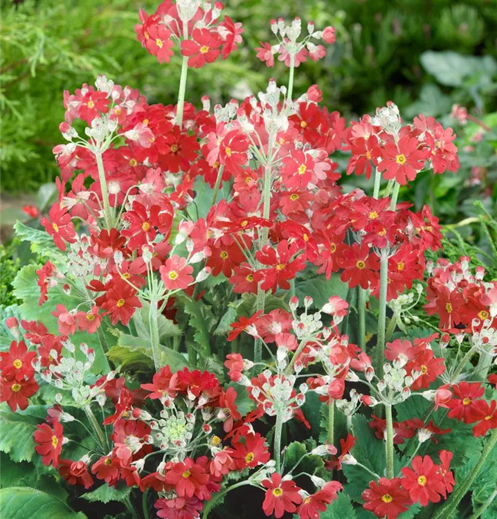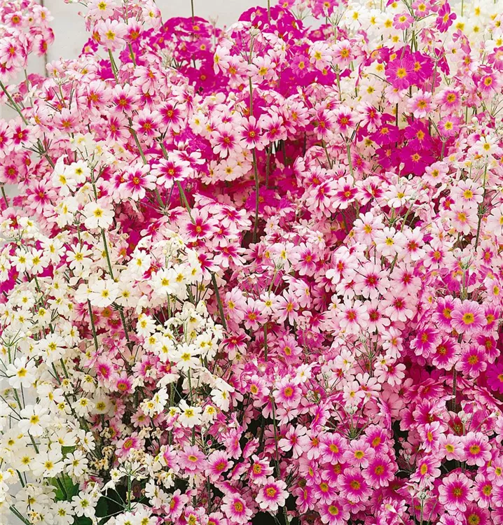 Die Braut-Primel (Primula malacoides) ist eine rosettenartige immergrüne Staude, die, je nach Sorte, tellerförmige Blüten in verschiedenen Farben bildet. An einem sonnigen Standort mit humosem, lockerem Boden erreicht sie gewöhnlich eine Höhe von ca. 45 cm und wird ca. 30 cm breit.