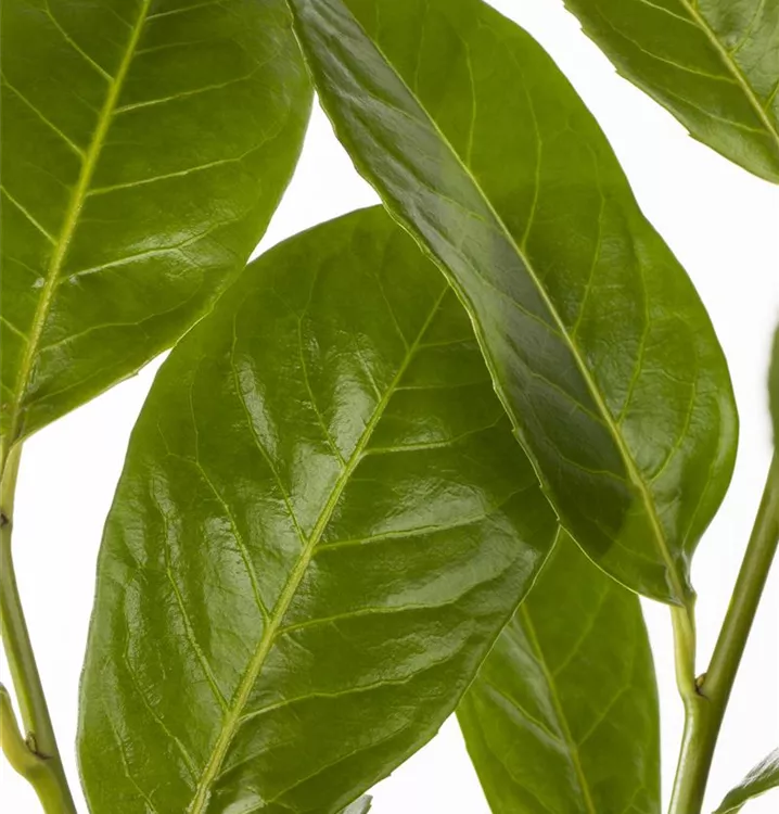 Die immergrünen Blätter der Lorbeerkirsche 'Rotundifolia' sind dunkelgrün, eiförmig, glänzend, wechselständig. Diese sind etwa 10 - 17 cm groß.