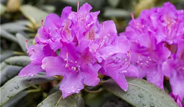 Rhododendron 'Alfred' bildet von Ende Mai bis Anfang Juni zahlreiche trichterförmige, in Dolden angeordnete, lilafarbene Blüten mit grüngelber Zeichnung auf hellem Grund.
