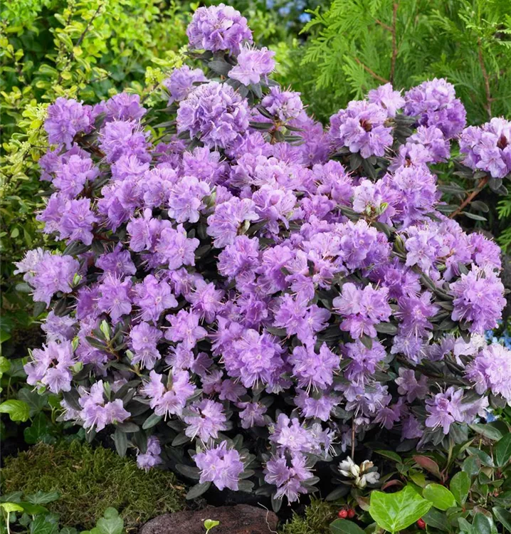 Der Kleinblättrige Rhododendron (Rhododendron impeditum) bringt von Ende April bis Mitte Mai ein wahres Blütenmeer in verschiedenen Farben (je nach Sorte) hervor. Dieses aufrecht, buschig, breit, dicht wachsende Gehölz erreicht gewöhnlich eine Höhe von 30 - 40 cm und eine Breite von 0,6 bis 1 m. Ein halbschattiger (bis schattiger) Standort und ein humoser, kalkfreier Boden schaffen optimale Bedingungen für ein gesundes Wachstum. Der Kleinblättrige Rhododendron ist gut frostverträglich.