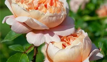 Die Strauchrose 'Colette'<sup>®</sup> (Rosa) ist eine reichblühende Rose, die im Garten eine besondere Rolle spielt. Die zahlreichen gefüllten Blüten sind lachsorange und erscheinen von Juni bis Oktober. Ihr wunderbarer Duft entfaltet sich besonders an sonnigen, warmen Tagen. Mit den richtigen Begleitern an ihrer Seite, kommt die Königin der Blumen besonders gut zur Geltung. Niedrige Stauden, Lavendel und Salbei eignen sich ganz gut für diese Zwecke.