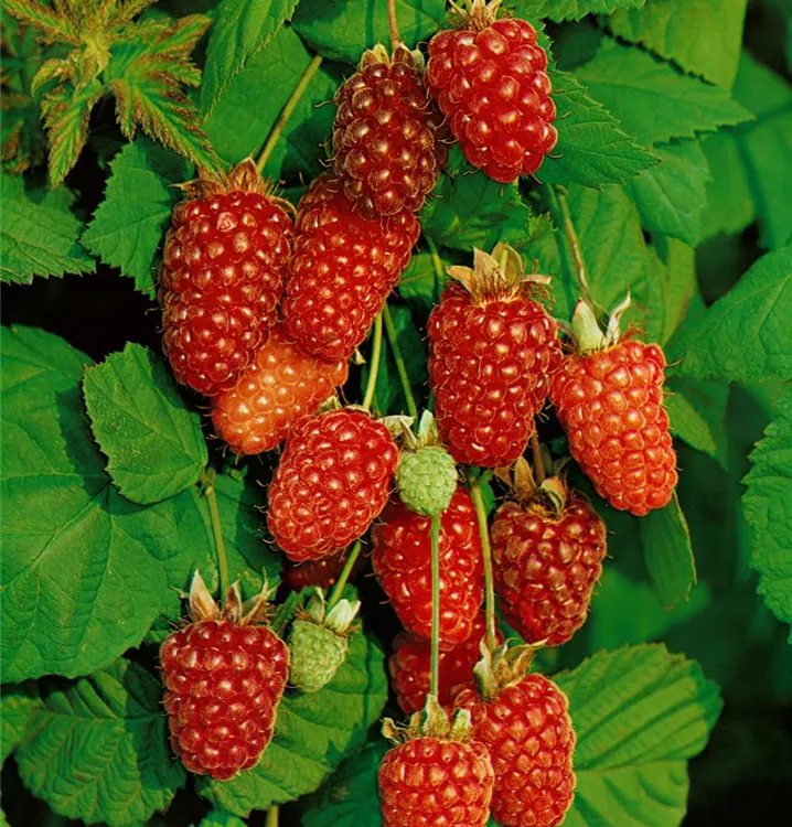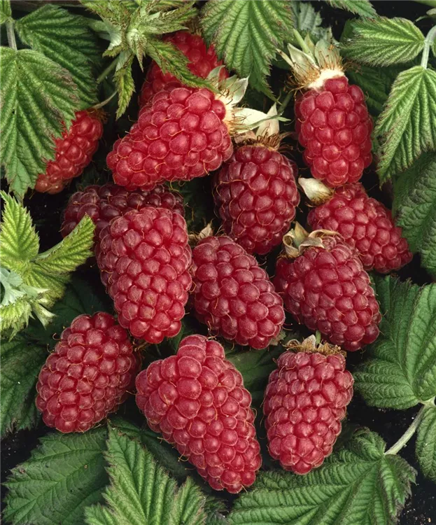 Die Taybeere 'Tayberry' (Rubus) bildet rote, große Beeren. Diese sind aromatisch, süß-säuerlich im Geschmack. Für eine ertragreiche Ernte ab Juli schaffen durchlässiger, nährstoffreicher Boden und ein sonniger Standort optimale Bedingungen. Auch ihre weißen Blüten sind eine schöne Erscheinung.