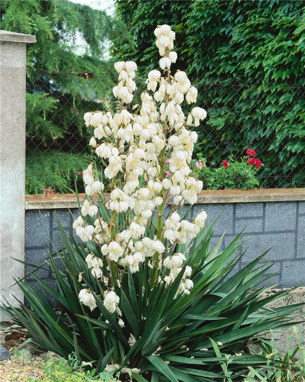 Yucca gloriosa bildet weiße Blüten ab August.